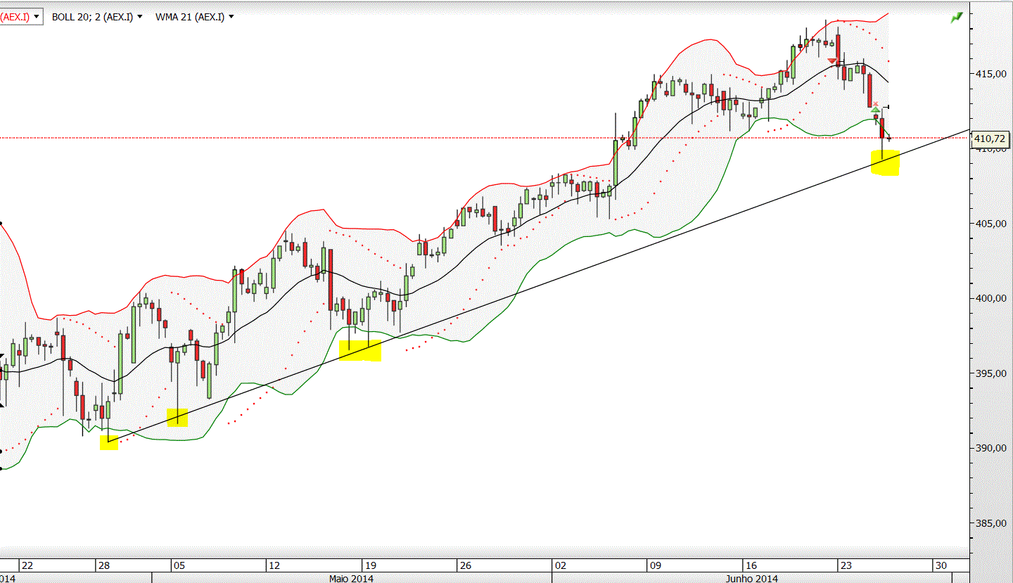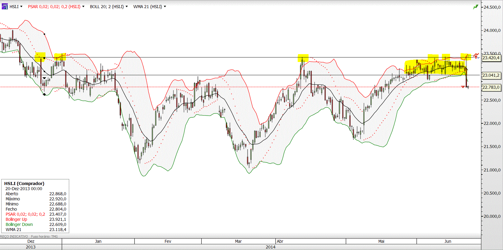 No curto prazo, após 28.5.2014, o índice vinha negociando num range apertado entre os 22.930 e os 23430.