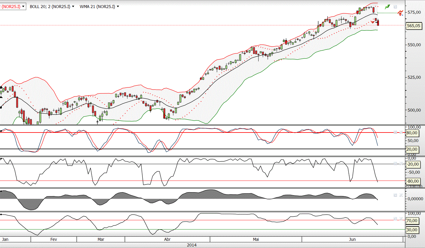 É certo que quebrou em baixa a Banda Bollinger inferior e que os indicadores técnicos oscilatórios já estão próximos da zona de sobrevenda.