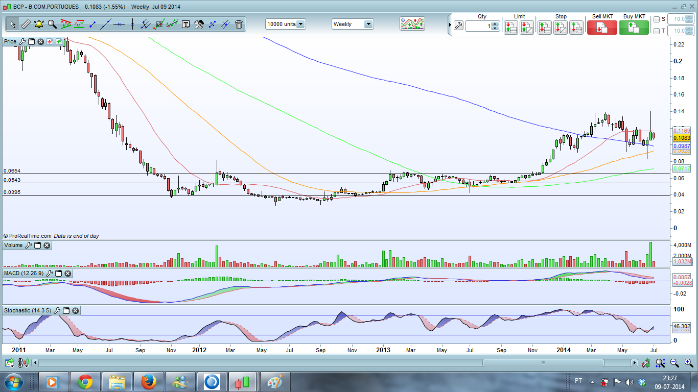 Pode estar alavancado longo ou curto em BCP via CFD's , Futuros, Warrants e factor certificates. As duas primeiras formas permitem ganhar muito ou perder ainda muito mais (factores temporais e de alavancagem puxados), logo só se devem escolher quando o potencial de retorno é igual ou superior a 75% (ex. Bes). Para warrants e factor certificates, a alavancagem vai de 2X a 8x, e portanto nunca põe em risco mais do que o capital lá colocado, mas também nunca atinge níveis de rentabilidade de 1000%. Estes últimos são ideais para situações de potencial de retorno igual ou superior a 60%, como a do BCP neste momento (em que a volatilidade pode pregar partidas, não queremos arriscar % muito, e não estamos seguros da evolução no curtissimo prazo).