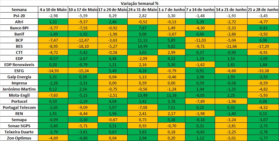 Do lado negativo referir também a JMT, que costuma ter um comportamento inverso ao do Psi-20, mas esta semana teve quedas de 4,82%.