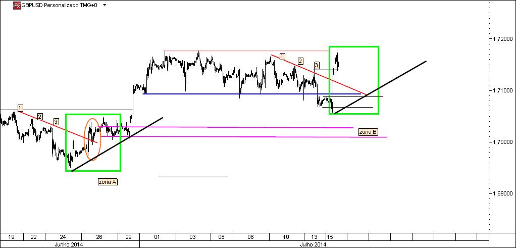 gbpusd 45 m: Preço quebrando a linha azul anteriormente referenciada. Quem quiser usá-la (e não haverá nenhum problema nisso) depara-se com a problemática da colocação da stoploss e sua relação com o target que tenha em mente. O que é que me dará segurança no sentido de usar a linha azul como referência para uma compra sem ter de esperar por uma eventual queda do preço até à zona rosa? Tão simples quanto isto: que o preço faça na zona B o que fez na zona A. Até que uma das hipóteses se concretize, continuo na "sala de espera".