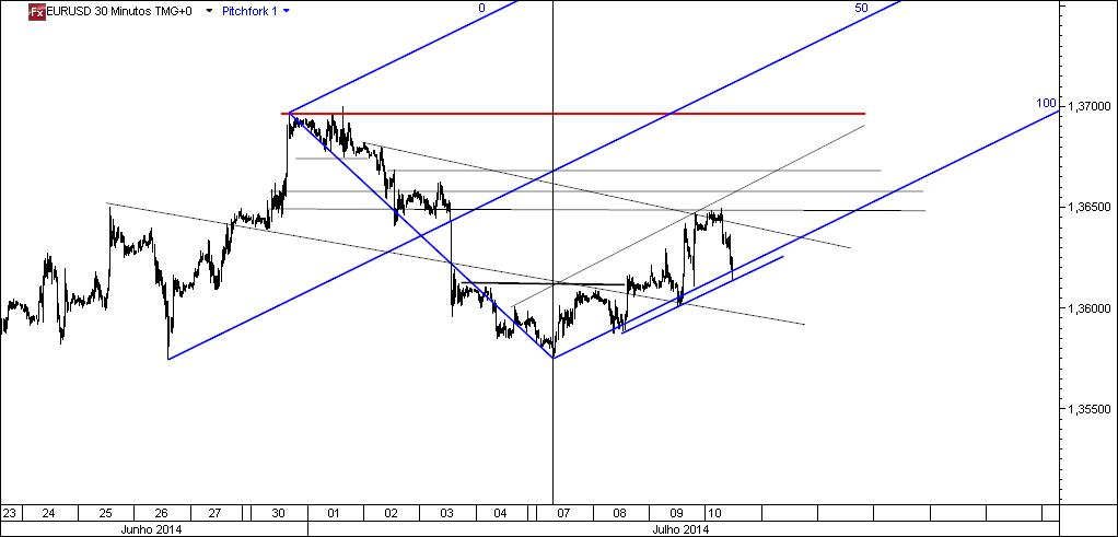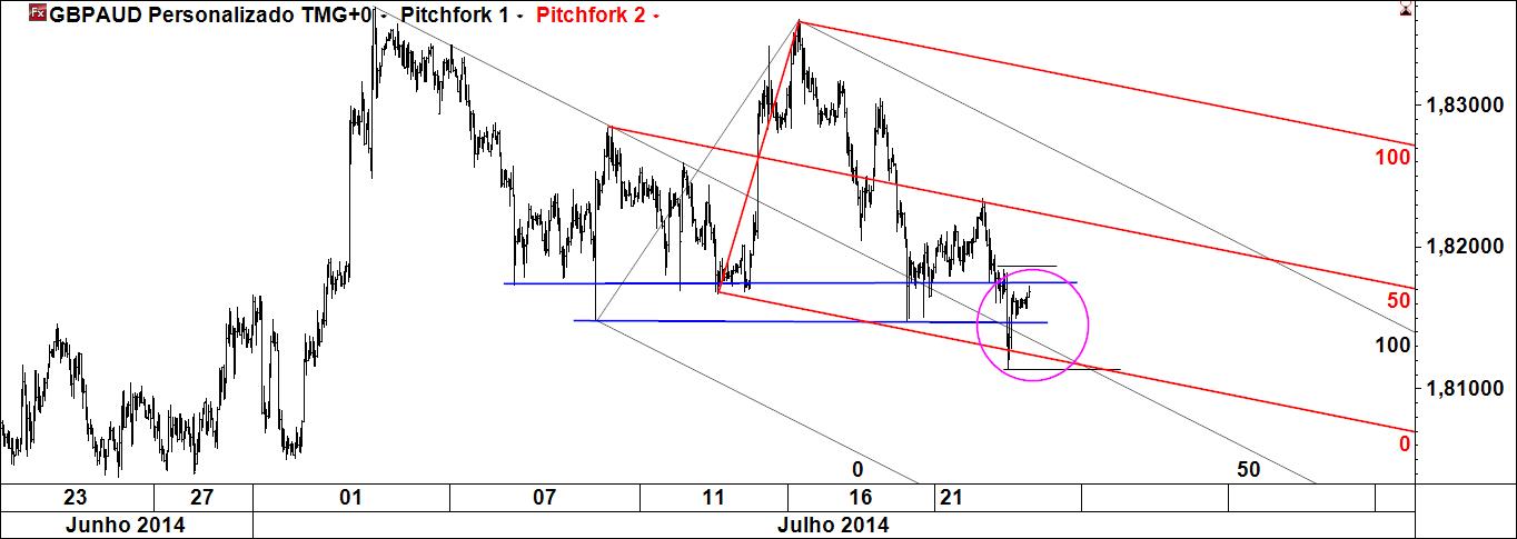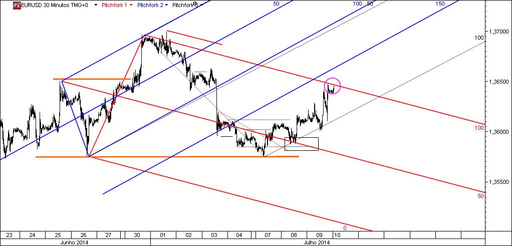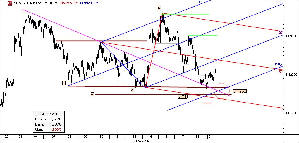 audusd 30 m: enquanto se espera pela formação do preço que nos poderá dar o pivot c do fork pode tentar-se aproveitar a banhada após o falso break down. É o set up denominado "ups! fui apanhado com as calças na mão!". Um pouco à semelhança do que se espera do eurusd num outro tópico.