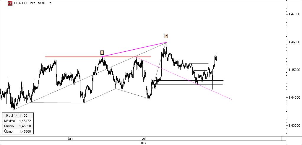 euraud 1 h: à medida que o preço avança sem nos dar confiança da formação do pivot c mais não resta do que irmos arrastando-o ao gosto do mercado. Quiçá assistiremos a um daqueles movimentos repentinos só para assustar, como por ex. o que foi feito há não muito tempo no 30y t-bonds 1 h; depois foi o que se tem visto.