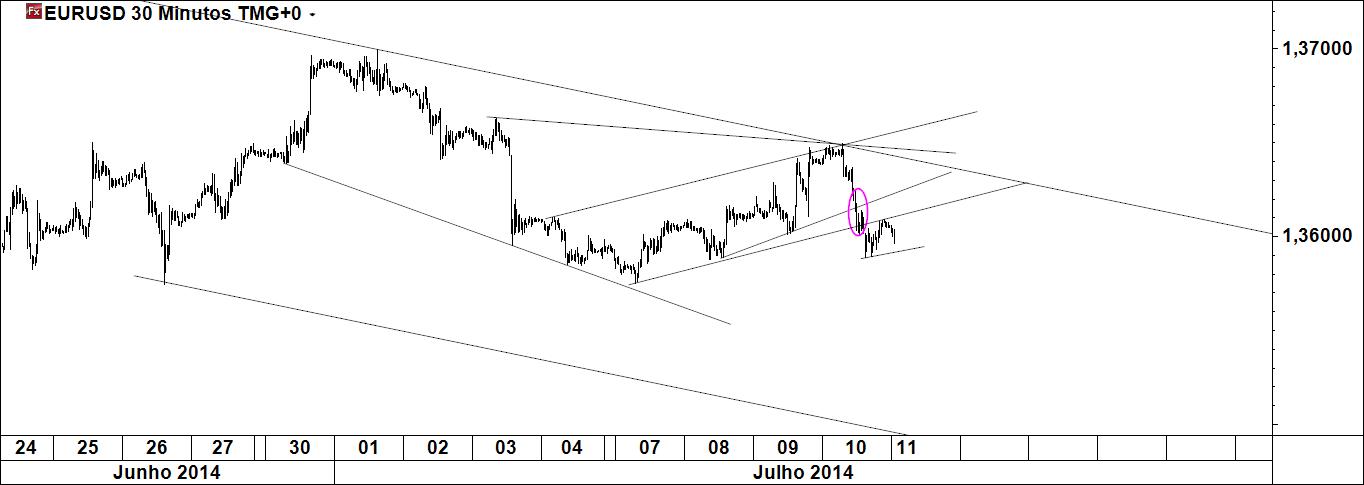 eurusd 30 m: enquanto se aguardava pelo 2º target, a stop (stop profit), entretanto colocada por baixo do último swing low, foi atingida, dando lugar ao encerramento da posição. Continua a perseguir-se nova oportunidade; aliás, já se encontra traçada nos seus elementos essenciais, como se pode ver do gráfico.