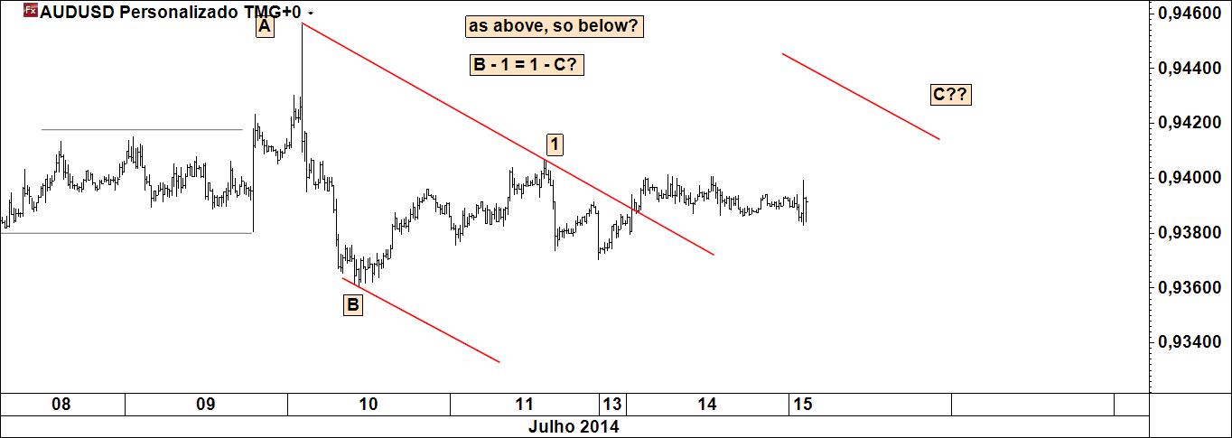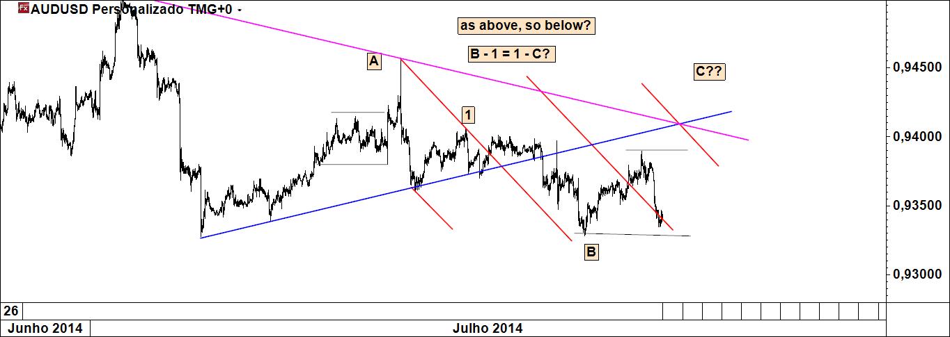 Um estudo no audusd 30 m para tentar encontrar uma área para colocar o pivot c do fork usando os pivots A, B e 1.