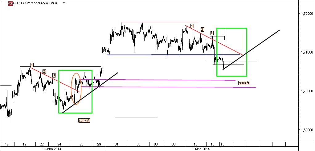 gbpusd 45 m: aproxima-se zona onde compradores "terão" de aparecer, se quiserem manter a tendência ascendente.
