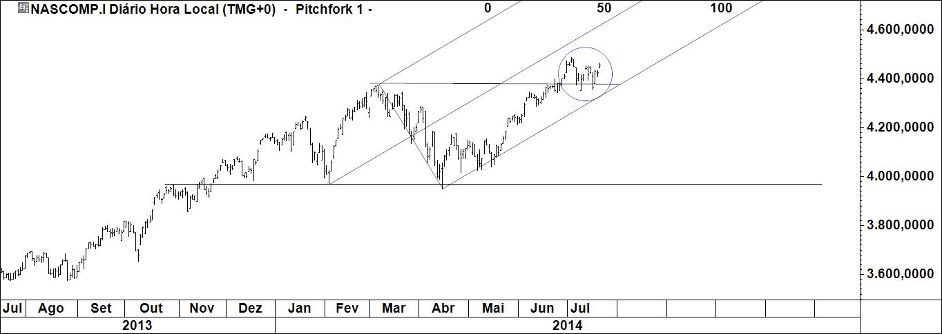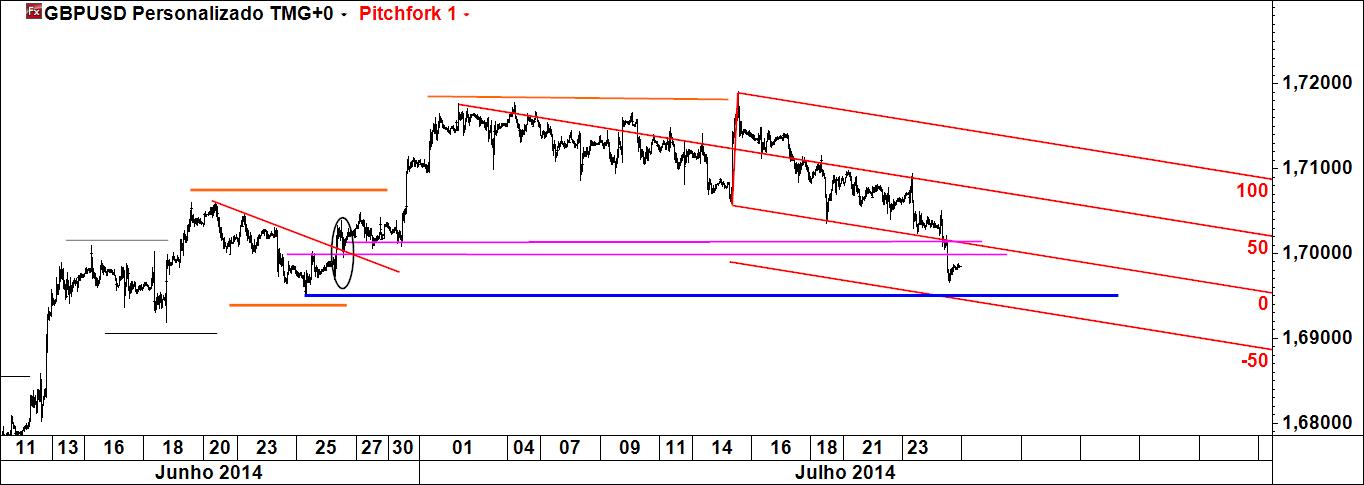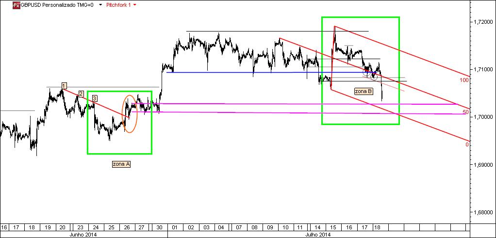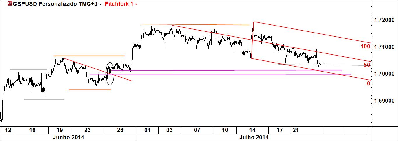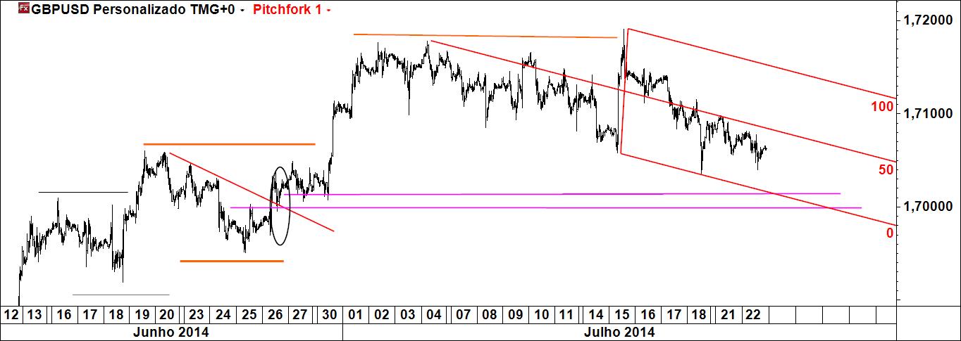 Gráfico 3: usando a metade do swing de controlo e o pivot 1 para construirmos a inside median line ou, se se quiser, linhas de acção-reacção (ambas sobejamente conhecidas no âmbito deste tópico).