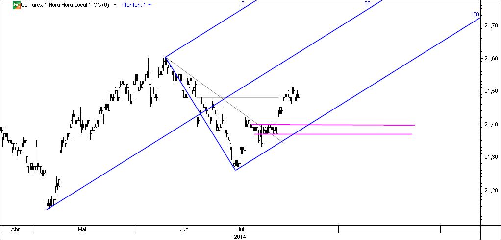 gráfico 2: fazendo um close-up ao preço para se destacar eventuais suportes: um seria dado pela linha multipivot (azul), o outro situar-se-á mais abaixo (rosa);