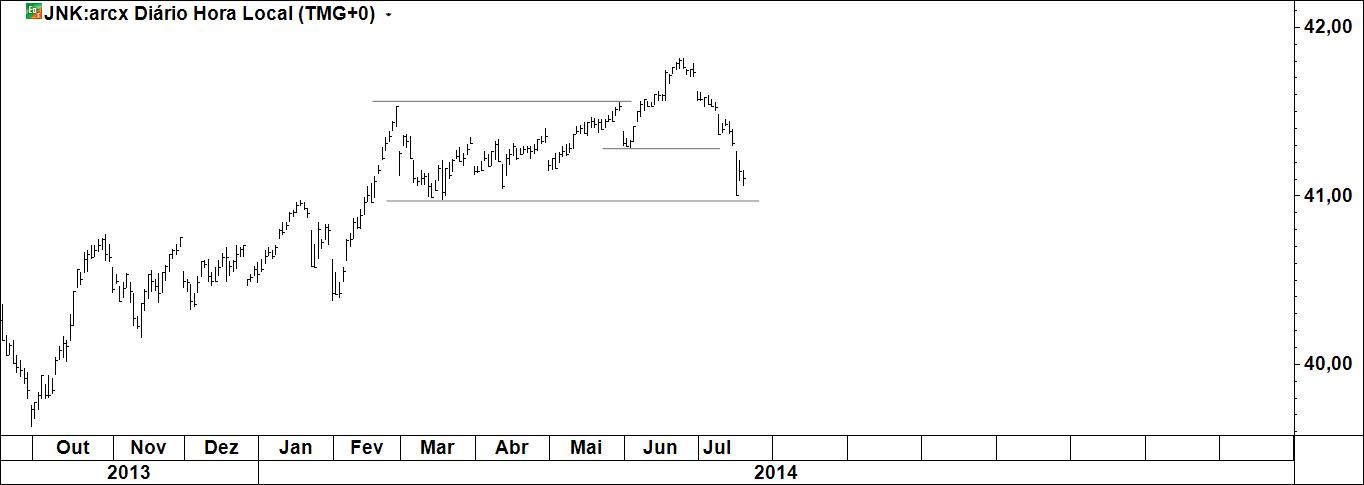 Um gráfico diário do JJK (SPDR Barclays High Yield Bond ETF) mostrando a fase inicial da fuga. Falta saber onde estancará e que mensagem isso traz para os mercados obrigacionista e accionista.