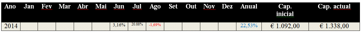 Por isso, os trades realizados no mês de Agosto foram residuais e traduziram-se numa menos valia de 1,69%, passando de um capital de € 1.361,00 para € 1.338,00.