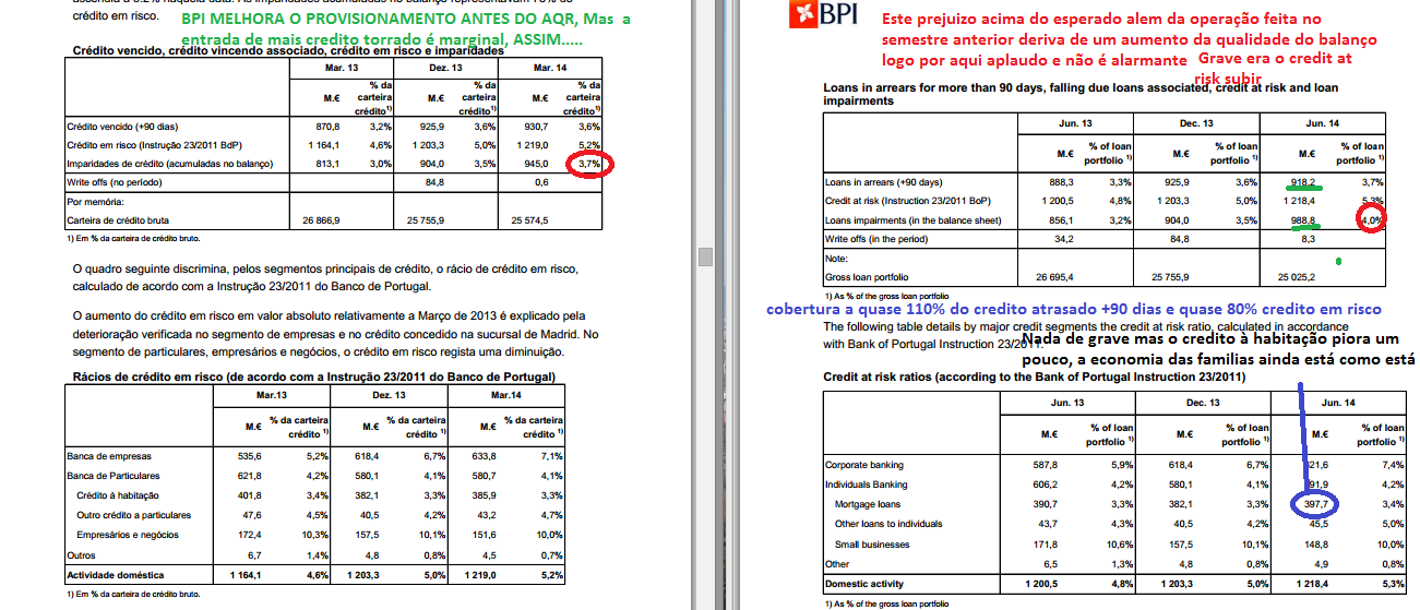 Vou começar deproposito pelas imparidades porque foi aqui que a meu ver saiu pior e elas foram maiores... mas isso não é nessáriamente mau e porque? porque num balanço já bem provisionado ficou ainda melhor... logo o bpi fez bem vem ai o AQR e para o resto do ano se a economia nao cair vejo este valor a cair tambem.... pois o nivel de provisionamento é muito bom.. ainda assim neste H1 custo do risco muito interessante em 71 pb base apenas digamos que por aqui que o prejuizo do bpi foi maior que o esperado... isto a mim dado que os ativos torrados se portaram bem nao me chateia nada... mas se o mercado nao for ao detalhe amanha talvez abra em queda eu pessoalmente estou confortável com o preço médio que tenho......abaixo de 1,40