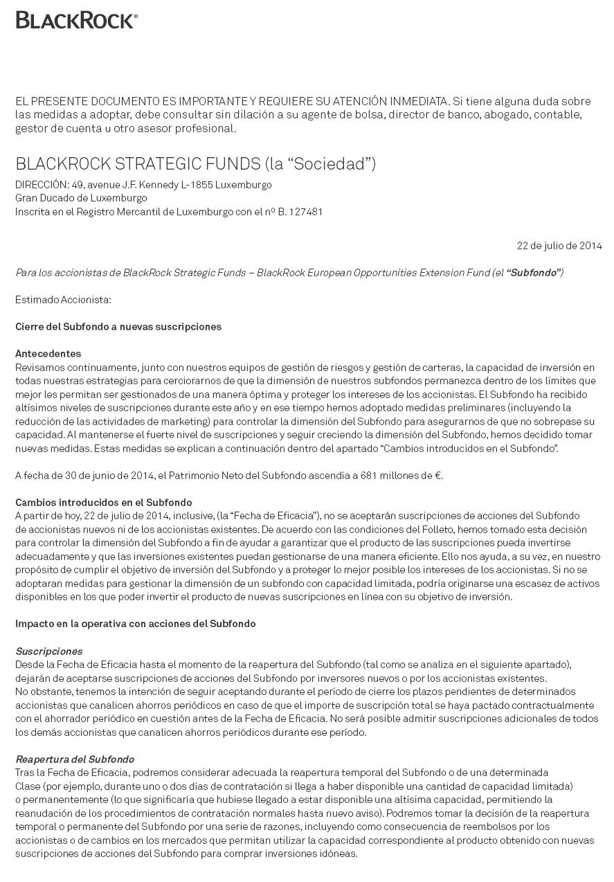 A comunicação da BlackRock sobre o fecho do fundo "BlackRock Strategic Funds - BlackRock European Opportunities Extension Fund" tanto para novos subscritores como para os existentes, enviada para os seus clientes Espanhóis, a explicar os motivos: