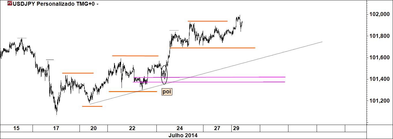usdjpy 20: dado que o preço fez um novo máximo antes de ter corrigido no sentido "estudado", o ponto de entrada que nos poderá interessar subiu; resta aguardar que o mercado nos dê um boa stoploss.