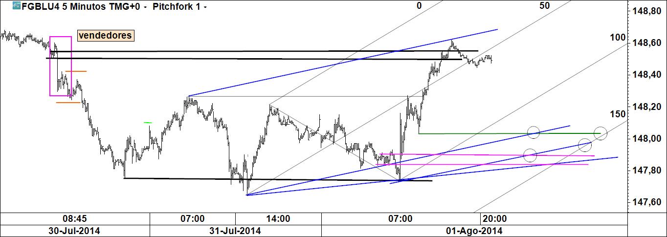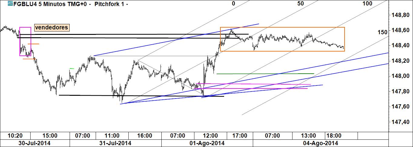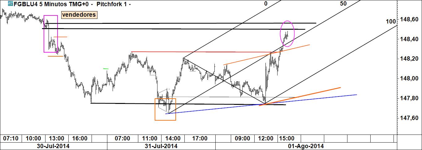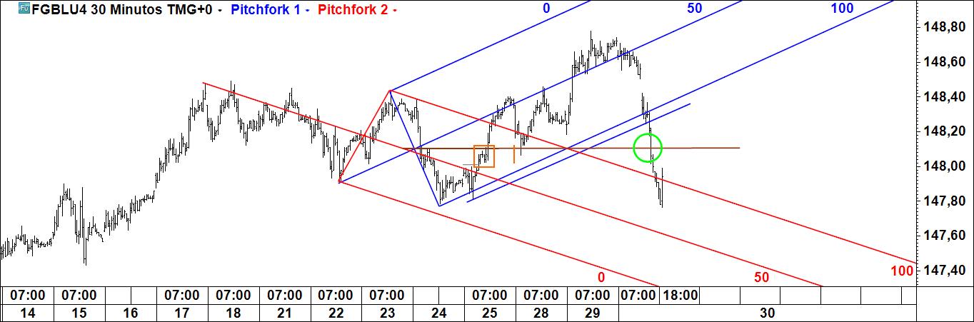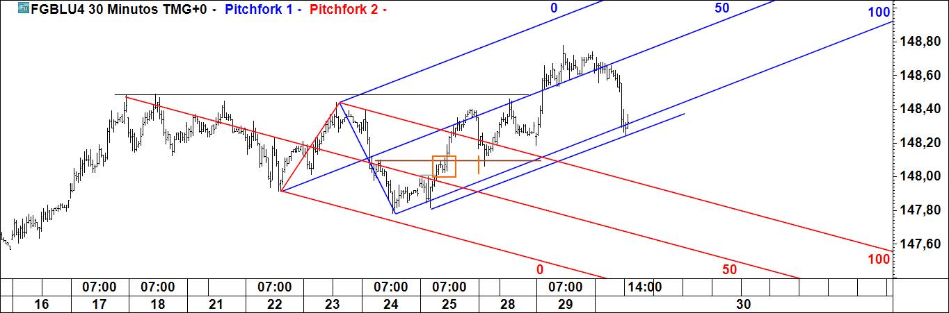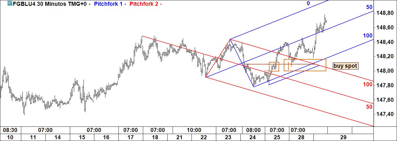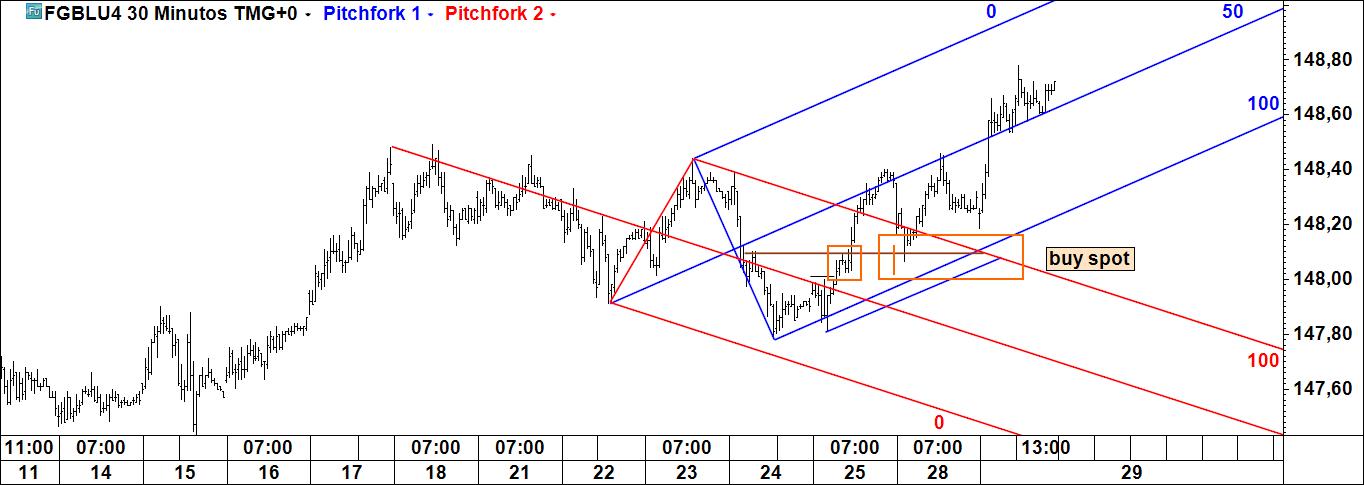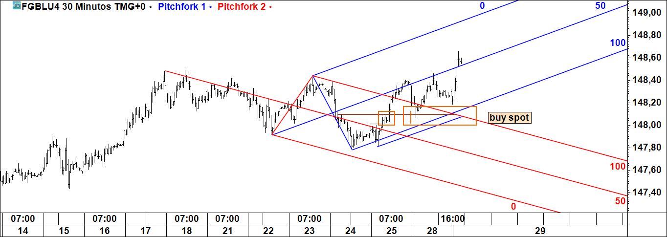 Primeira oportunidade: no Verão há quem procure colocar o dinheiro "ao fresco" (comprando por ex. bunds). Para esse efeito, eis uma oportunidade no fgblu 30 m, com identificação do buy spot, colocando-se a stoploss abaixo do pivot b do fork ascendente e target (pelo menos) na sua linha média superior. O porquê do negócio: encontrando-se o preço em consolidação no decurso de uma fase ascendente procura-se encontrar um movimento correctivo que nos dê um bom ponto de entrada em face do ratio r:r 1/3. Esse ponto de entrada é-nos dado pela confluência das linhas que uso.