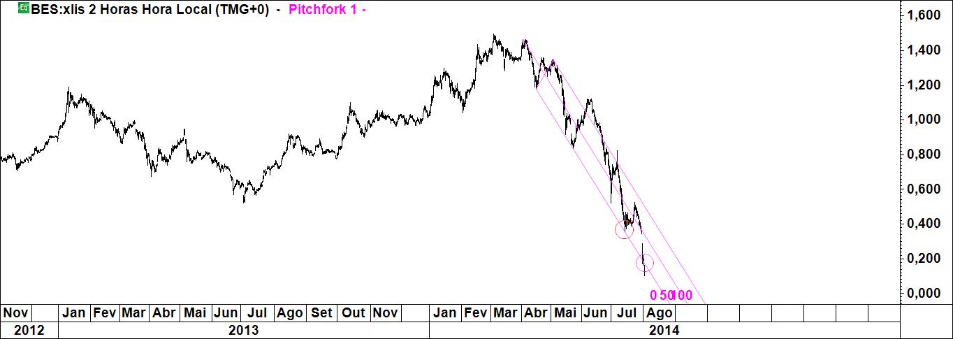 Nos dias 6, 10 e 15 de Maio coloquei neste tópico vários gráficos do bes. Nos dias 16 e 18 de Maio foram colocados novos gráficos com outras linhas: um também aqui e outro no meu tópico "oportunidades especulativas". No dia 25 de Maio todos esses gráficos foram complementados com um outro, também aqui colocado, onde aparecia desenhado a rosa um pitchfork que projectava o provável caminho do preço (à data). Todos os gráficos transmitiam a mesma mensagem, que tão evidente era. Quem tivesse tido o cuidado de as ter estudado e perseguido a evolução do preço teria feito como eu.
