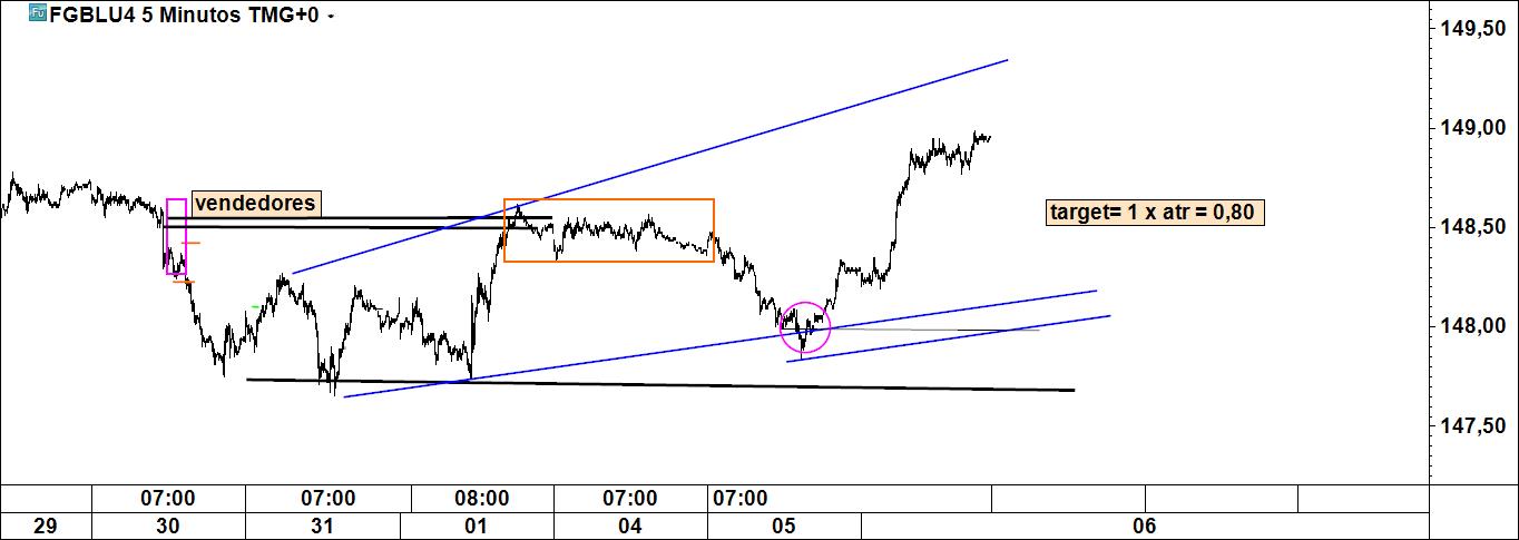 bunds 5 m: primeiro target (correspondente a 1 x atr) foi atingido. Stoploss em b/e e aguarda-se o desenvolvimento do preço, na esperança que vá ao 2º target.