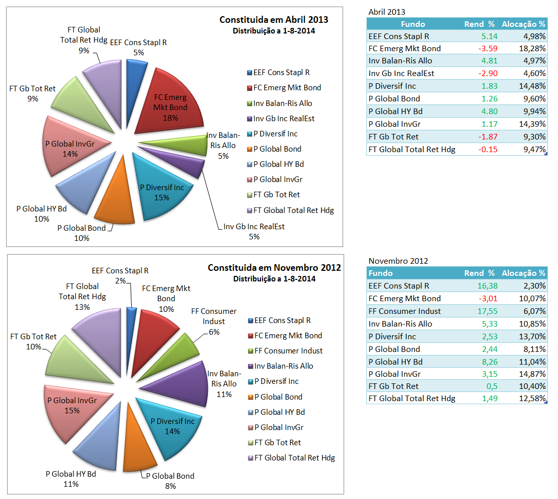 As carteiras estão atualizadas à data de 1-8-2014. Os títulos "Abril de 2013" e "Novembro de 2014" foram as datas de constituição das mesmas. A % é a rentabilidade desde essa data.