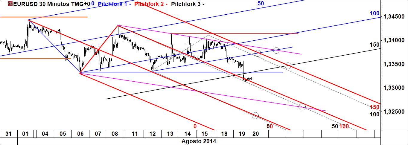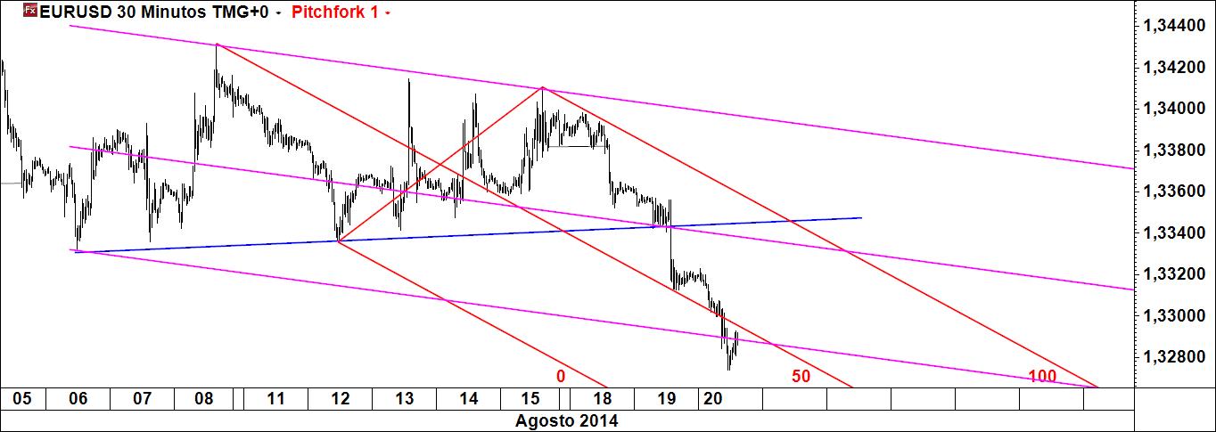 eurusd 30 m: dado a recente evolução do preço, torna-se necessário rever os alinhavos. Ponto de entrada assinalado pela confluência, com stop acima do último swing high e target na paralela equidistante da median line.