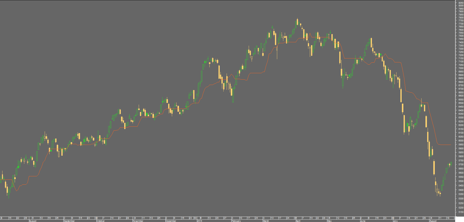 o autor, estou em crer, partiu de um método de breakouts à maneira do Donchian; neste caso eu usei a média aritmética simples do canal superior com o canal inferior, para um breakout de 20 dias; eis o que podes calibrar, a meu ver