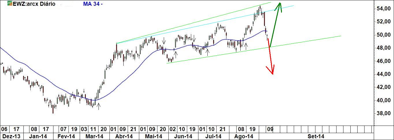 Deixo novamente o gráfico do ewz, único activo que estudo quando quero analisar o comportamento da economia/bolsa brasileira.