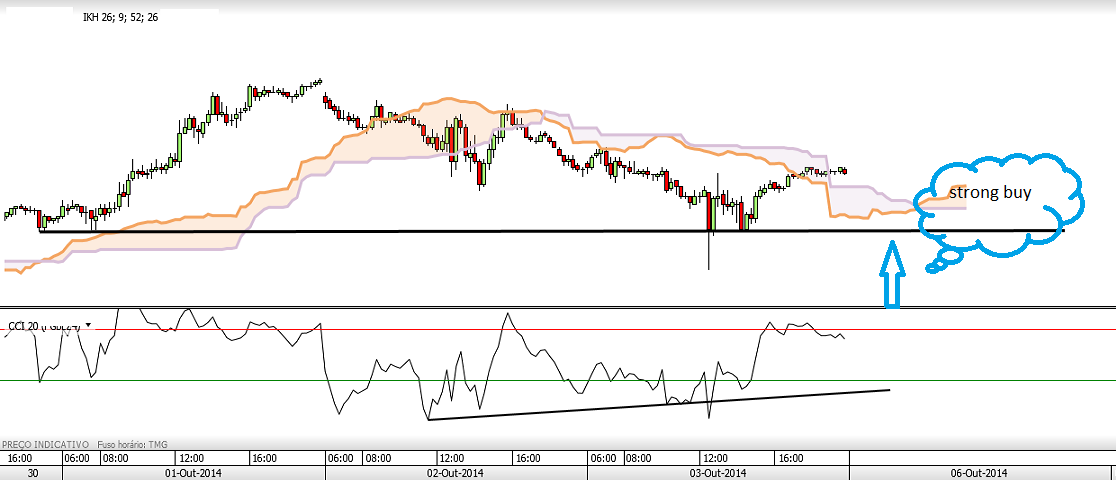 Preço negociando em direcção à nuvem, que dará suporte, e fazendo higher highs em direcção a suporte horizontal. CCI ascendente, com lta que poderá dar suporte. Penetrando o preço na nuvem ou aproximando-se dos seus limites (o que poderá fazer inflectir o cci, circunstância que será ignorada) será dada ordem de compra do activo, sempre com os mesmo parâmetros de risco e lucro.