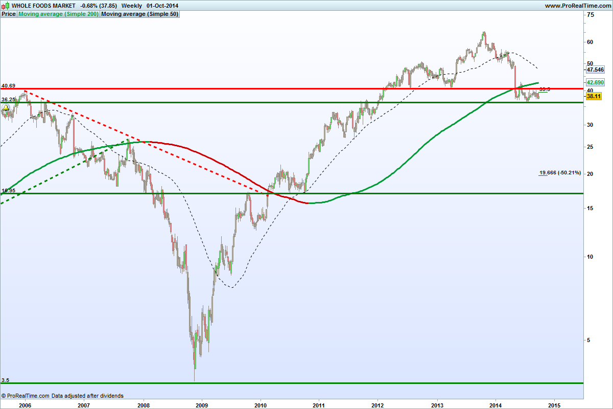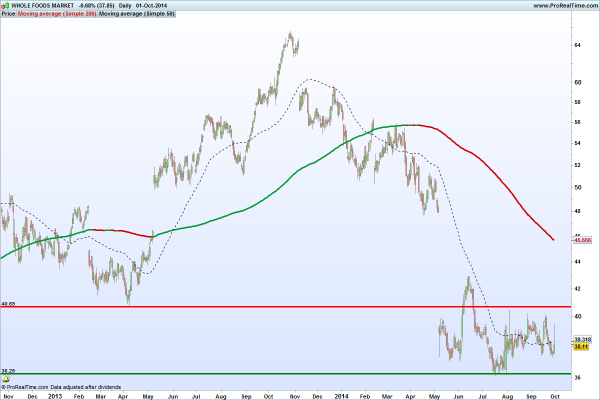 Esqueci-me de dizer que coloquei uma ordem short na Whole Foods Market (WFM) por volta dos 39,90.