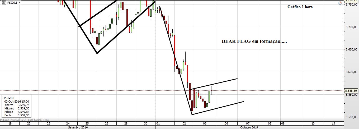 1- Bear Flag em formação nos gráficos de 4h e 1h e cuja projeção aponta para os mínimos de Agosto.