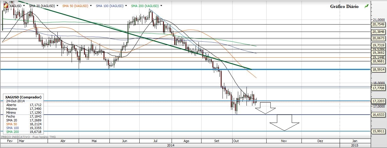 Em relação ao Ouro deixo aqui a minha ideia para os próximos tempos; a queda. E porquê? Como já aqui foi dito e apresentado o Preço tem-se desenvolvido dentro de um Triângulo Descendente e, desenvolvendo-se nesta figura, o Preço tende a quebrar em baixa a base de Triângulos Descendentes. Foi assim na Prata, embora aqui tivesse acontecido um falso breakout para cima, para só depois quebrar em baixa o também Triângulo Descendente e cuja trajetória foi sendo acompanhada neste tópico. Uma das hipóteses que eu colocava a mim mesmo era que isso também pudesse acontecer no Ouro, mas pelo menos ir de novo à linha de hipotenusa do triângulo era uma hipótese realista. Ao mesmo tempo a Prata também deveria quebrar algumas resistências e na melhor das hipóteses ir visitar a base do seu antigo Triângulo (matar umas saudades). Mas isso não aconteceu, aliás a Prata não conseguiu passar a resistência dos 17,80 tendo estado a tentar aguentar-se na zona dos 17,22 tendo na última sessão fechado abaixo deste suporte. Ou seja, neste mês de Outubro depois de uma reacção em alta ao suporte dos 16,65 a Prata tem vindo a perder fulgor e fechou a semana como já foi dito abaixo do suporte (minha referência) dos 17,22. Isto revela fraqueza e depois disto porque razão haveria a Prata agora de ir à base do seu antigo Triângulo???
