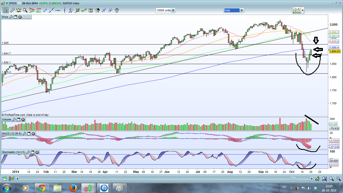 Houve ali uma zona de rejeição do preço com um higher low e o preço subiu mas a zona assinalada a amarelo entre os 1885 e os 1905( Media Movel) é que vai ser uma zona de esclarecimento importante para os proximos dias...pessoalmente...depende dos earnings e estou relativamente optimista face aos earnings...mas podem correr mal...perfeitamente natural o preço ter parado na 6feira na zona inferior desta zona... Mas nao tenho ilusoes...as mm estao descendentes...a tendencia para ja é descedente!