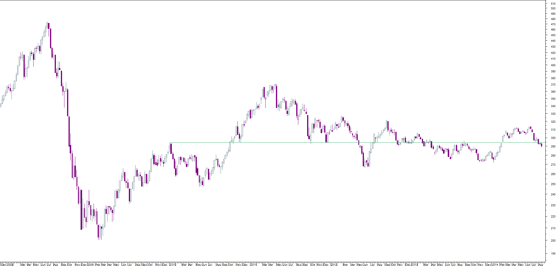 Wheat: tem uma zona clara de suporte pelos 420, pelo que uma opção será comprar ai; outra será aguardar uma quebra, em força, da zona dos 600-620;