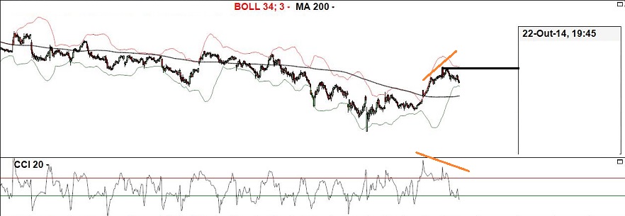 Já são sobejamente conhecidos indicadores por nós usados para negociar a favor da tendência. Esses mesmo indicadores podem ser usados para negocirar em divergência: neste caso detectamos uma divergência entre o preço e o indicador. Queremos igualmente aproveitar a circunstância do preço se encontrar acima da mm200, o que constitui apenas uma consequência da correcção do preço. Assim, e porque se espera que o activo apresente resultados trimestrais que irão ser negativos e dado o típico comportamento aquando da publicação de notícias, hoje iremos dar ordem de venda ao mercado logo na abertura. A ideia é aproveitar o eventual movimento negativo que se espera no dia da apresentação dos resultados.
