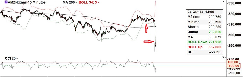 Ontem dissemos: Já são sobejamente conhecidos indicadores por nós usados para negociar a favor da tendência. Esses mesmo indicadores podem ser usados para negocirar em divergência: neste caso detectamos uma divergência entre o preço e o indicador. Queremos igualmente aproveitar a circunstância do preço se encontrar acima da mm200, o que constitui apenas uma consequência da correcção do preço. Assim, e porque se espera que o activo apresente resultados trimestrais que irão ser negativos e dado o típico comportamento aquando da publicação de notícias, hoje iremos dar ordem de venda ao mercado logo na abertura. A ideia é aproveitar o eventual movimento negativo que se espera no dia da apresentação dos resultados. A ordem de venda - short selling - foi dada logo na abertura do mercado norte-americano. Trata-se da Amazon que acaba de apresentar resultados trimestrais, surpreendendo negativamente o mercado.