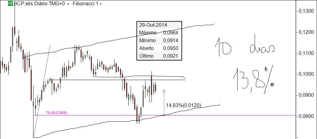 Naquela data o preço estava a 0,0835 e a fibo estava a 0,0803, como se pode atestar pelo gráfico que apresentámos. Sexta-feira a cotação encerrou cerca de 13% acima do valor de compra. Nada mau para um período de 15 dias. E amanhã é bem capaz de fazer um gapezito.Construindo uma oportunidade "única" de compra de BCP em saldos e com recurso a uma única ferramenta: pelas bandas da fibo 76,4.