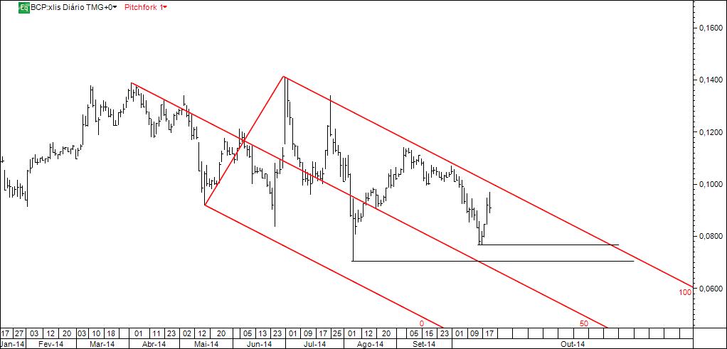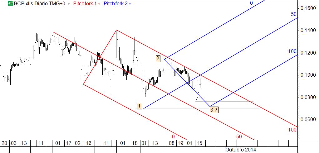 Para o regresso decidi colocar um gráfico diário do BCP usando uma das minhas técnicas preferidas. Pode ver-se que o preço está delimitado pela forquilha descendente o que, só por si, não quer dizer nada de negativo quanto à sua evolução, mas apenas de momento que "sofre" a força repulsiva da sua linha média superior. Se vencida, isso constituirá um sinal de força. Isto não quer dizer que a compra não possa realizar-se antes de ser ultrapassada. Pode perfeitamente equacionar-se uma compra enquanto se mantiver do lado de cá da linha; tudo dependerá do tipo de investimento que se queira fazer e do risco que se queira assumir, mormente em caso de stoploss (para quem a use). Caso tivesse interesse em seguir esta cotada, usaria os pivots 1, 2 e futuro 3 para construir uma forquilha ascendente e a partir dela acompanhar o preço e sua reacção às linhas (ver 2º gráfico para mero exemplo), eventualmente usando-a para comprar e vender.