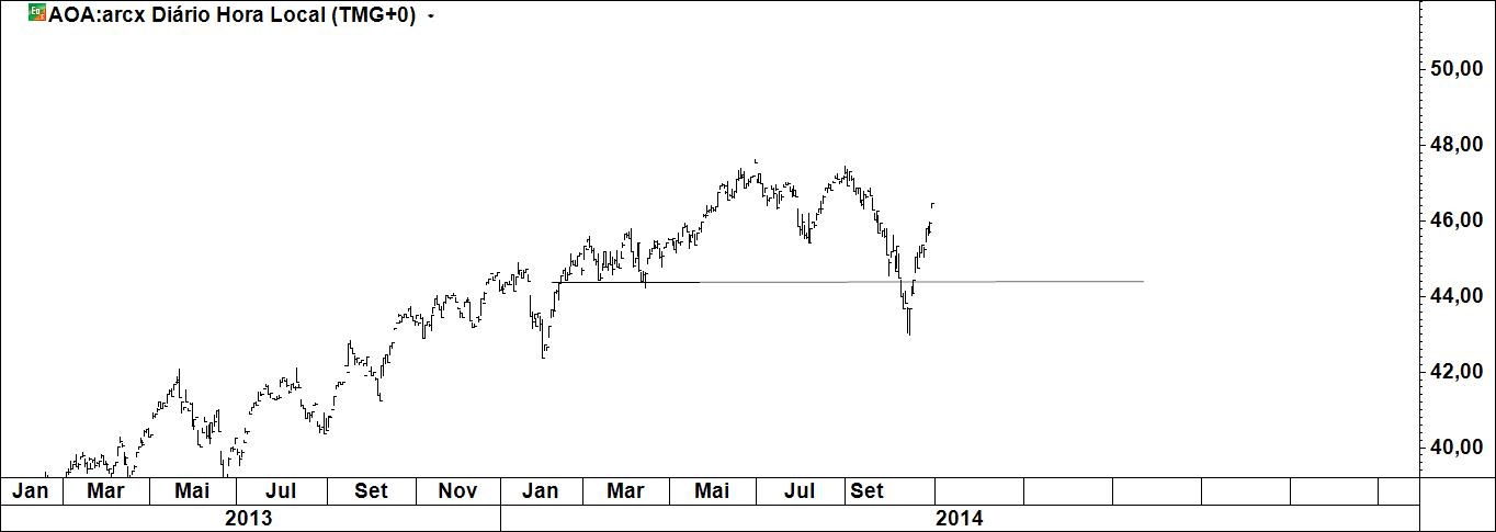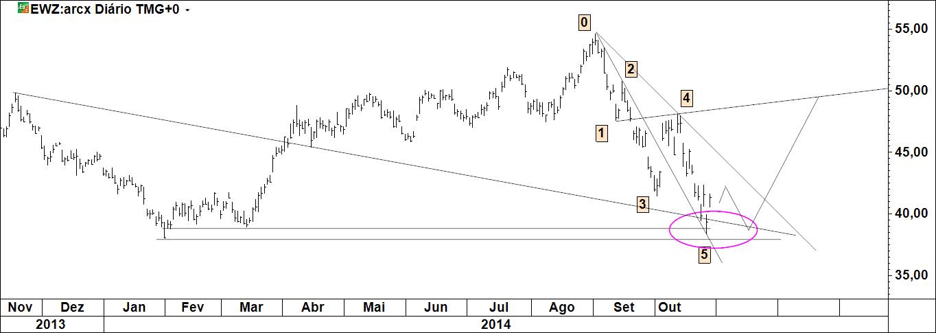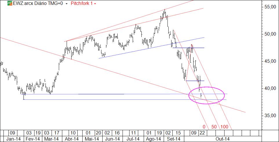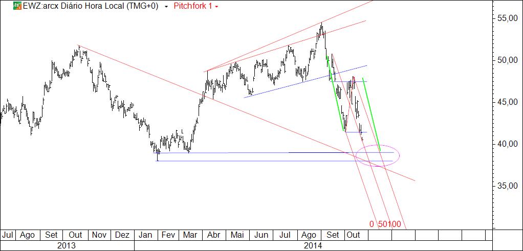Voltando ao gráfico que aqui coloquei no dia 23 sobre o EWZ: os especuladores lá conseguiram colocar o preço na zona. Chegou o momento da não-hesitação.