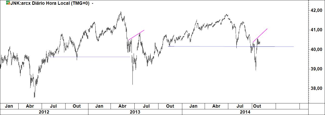 Analisando o ETF das obrigações HY - JNK : SPDR Barclays High Yield Bond ETF - e o Russel2000 (terá feito um falso break) não será descabido dizer que os investidores se mantêm confortáveis com a exposição ao risco, o que pode constituir um sinal positivo quanto ao futuro pulsar dos mercados.
