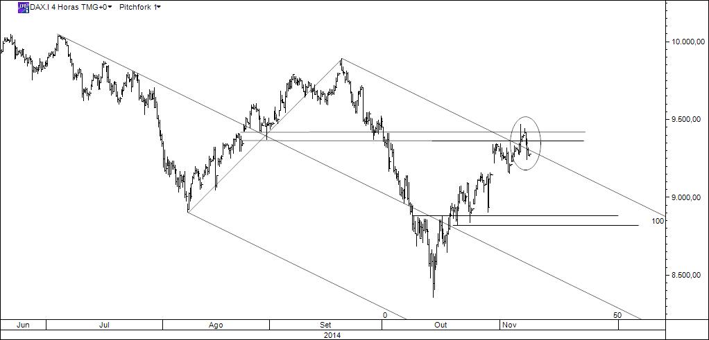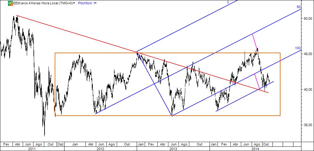 dax 4 h, sp500 4 h, eem diário e fxi diário: bem visíveis as zonas com interesse especulativo.