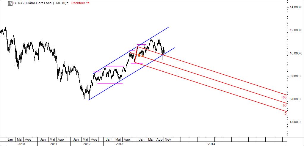 Lembrei-me de olhar para o ibex também num gráfico diário. Quando o abri deparei-me com o que se pode ver abaixo e de repente lembrei-me: os desenhos foram por mim feitos neste tópico. Fui consultar os gráficos postados e efectivamente confirma-se: foram aqui colocados no dia 26 de Abril.