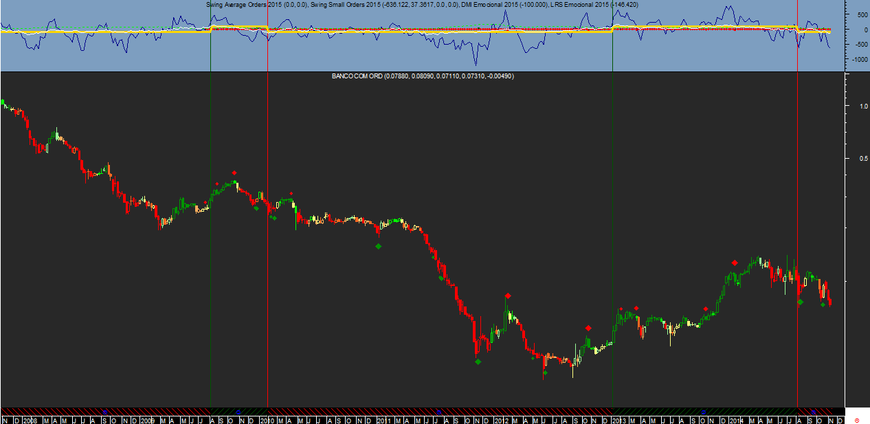 Enquanto o de longo prazo se destina a tentar descobrir os ciclos tendenciais predominantes, aquilo a que chamo a tendência no âmbito deste sistema de trading, o de curto prazo destina-se a descortinar os ciclos de curto prazo e que disparam sinais anti-trend, ou seja, quando o clima emocional está muito positivo dispara sinais de venda em swing e quando está muito negativo atira cá para fora com sinais de compra oscilatórios.