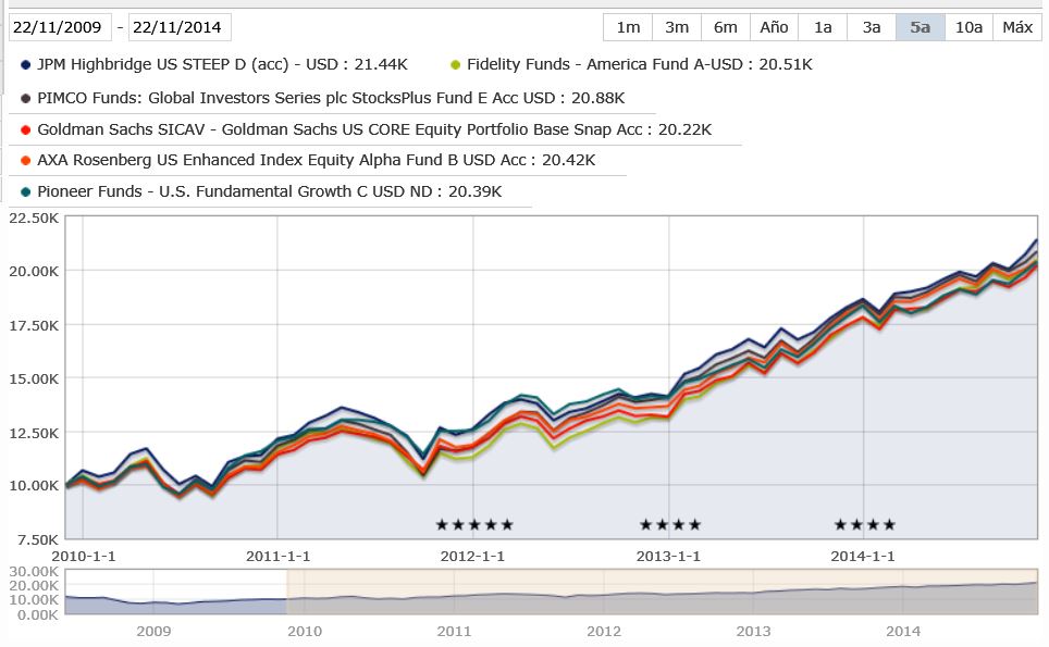 O fundo da Pioneer é o único que não pertence à categoria Morningstar EUA Cap. Grande Misto, pertence à Cap. Grande Crescimento, mas foi introduzido por ser um dos mais famosos nas escolhas dos foristas, na versão em EUR.