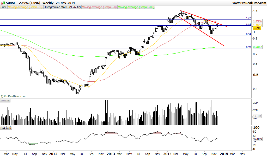 A seguradora AXA vem desde o inínico de 2014 num ciclo descendente, respeitando uma LTD que colecionou 5 toques. Em Agosto mostrou bastante força ao não só quebrar esta LTD em alta, como 3 antigos lower highs, após o que teve o queda de 15% acompanhando a tendencia global.. A semana passada o suporte que se formou no último mínimo impediu a cotada de realizar um lower low, o que constitui mais um sinal de força.