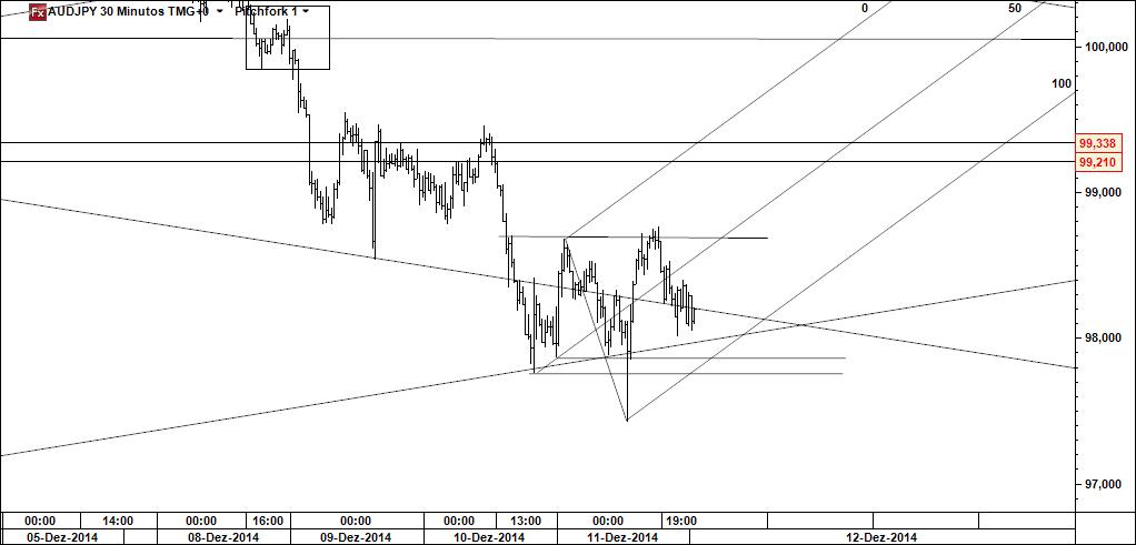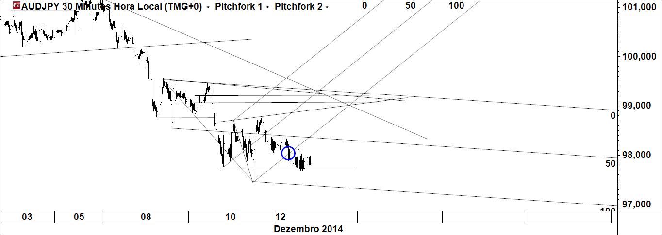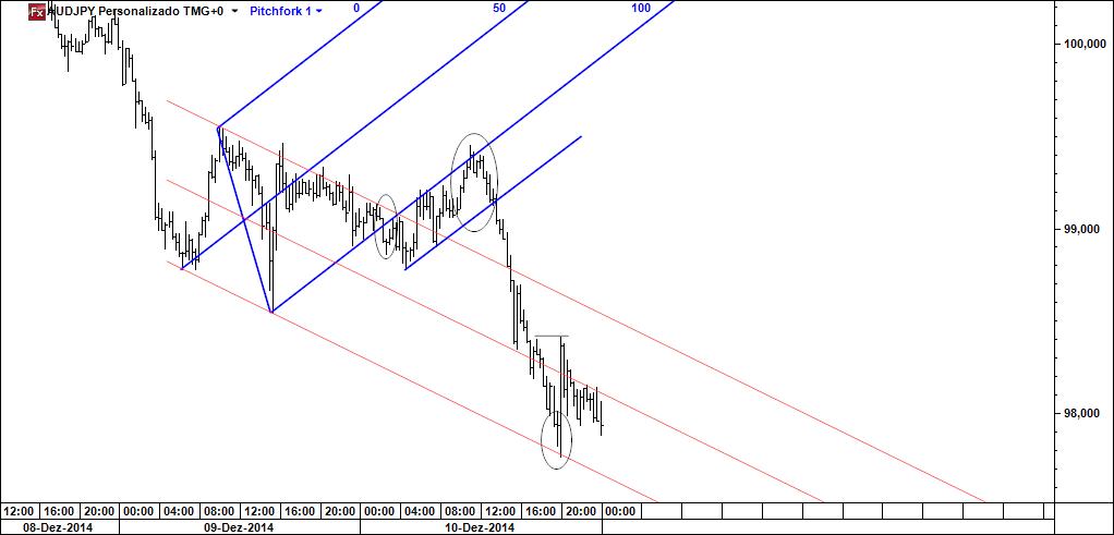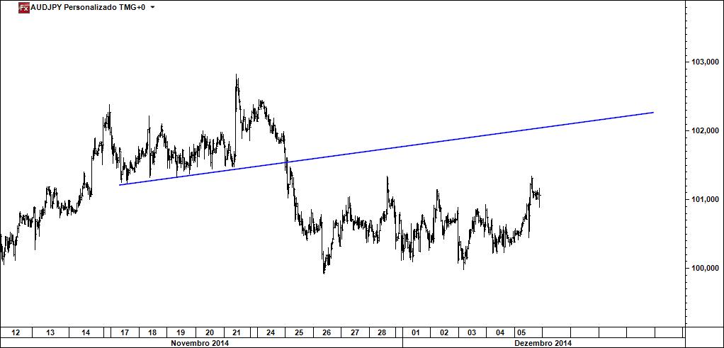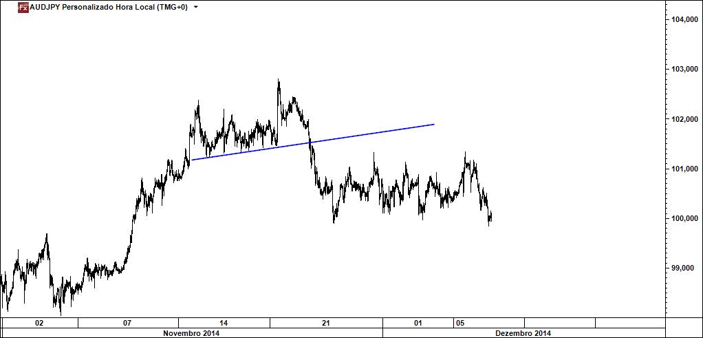 audjpy 45 m: para se comprar e vender apenas se precisa de uma linha. Tudo o que seja construído posteriormente dependerá dela. Neste caso a linha traçada dá toda a informação necessária para criar um negócio: abaixo dela é vender, acima dela é comprar. Se se vende ou compra agora ou mais tarde dependerá do estilo de negociação de cada um e do que se deva entender por target e stoploss. Quem quiser comprar agora pode ver o tamanho do lucro caso o preço salte para cima dela, por comparação à entrada com este acontecimento. O mesmo raciocínio é aplicável à venda. Em qualquer das situações também é visível o tamanho da perda.
