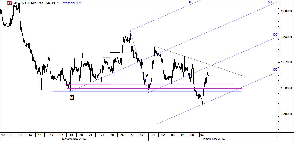 Chico, só para esclarecer que isto não são só rosas. Tinha mencionado (1/12) a abertura de uma posição no gbpusd que de momento está em perda, como se pode ver do gráfico infra. Sucede que o que me tem safado até ao momento é a colocação da stoploss abaixo do pivot A em um valor aproximado a 2 atr do timeframe em causa. Para já está a aguentar-se, mas tudo pode acontecer (terá chegado a minha ver de ser joãomourizado?) Que o "João Moura" está em campo não há dúvida.