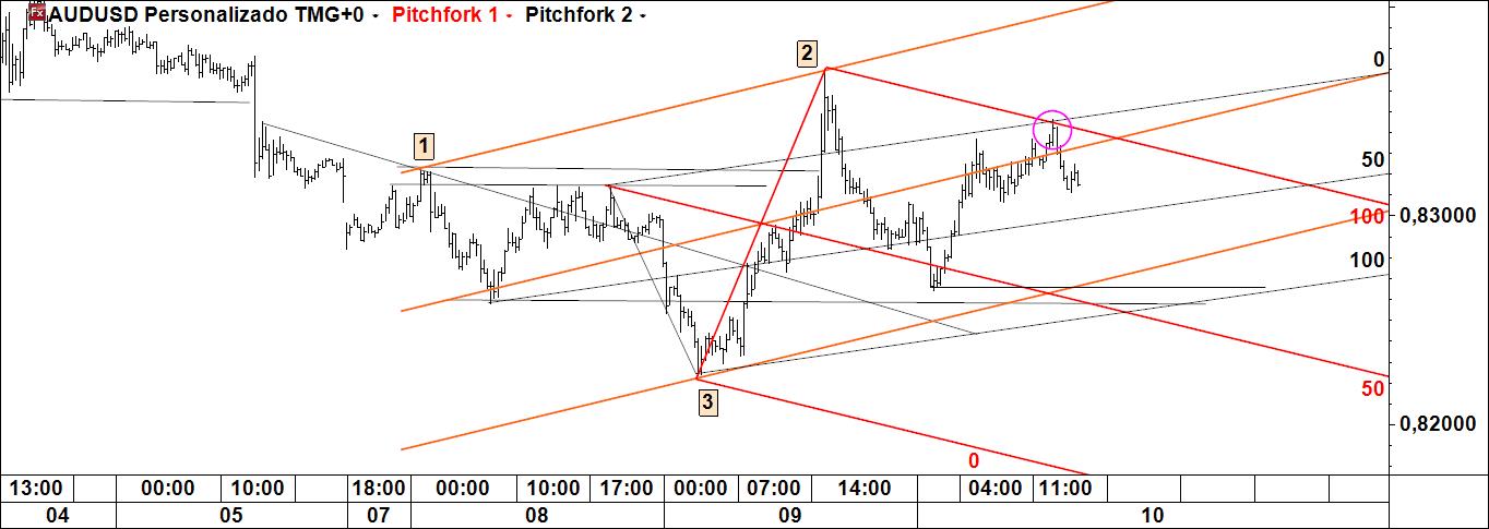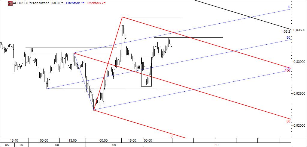 De regresso ao audusd para mais 2 oportunidades especulativas com base numa eventual "banhada" à linha inferior do fork modificado de Schiff.