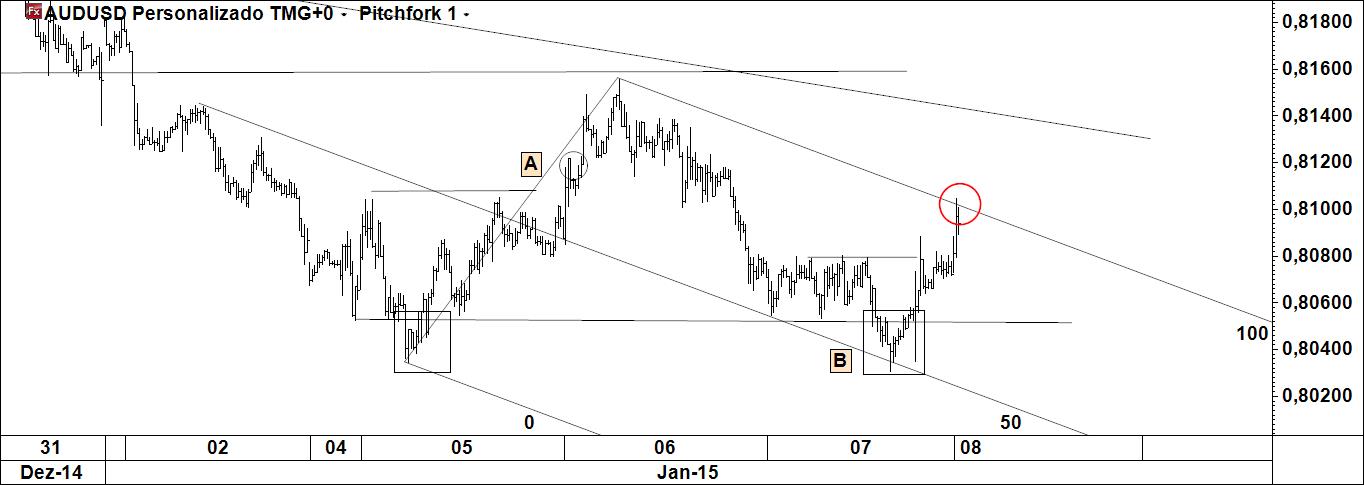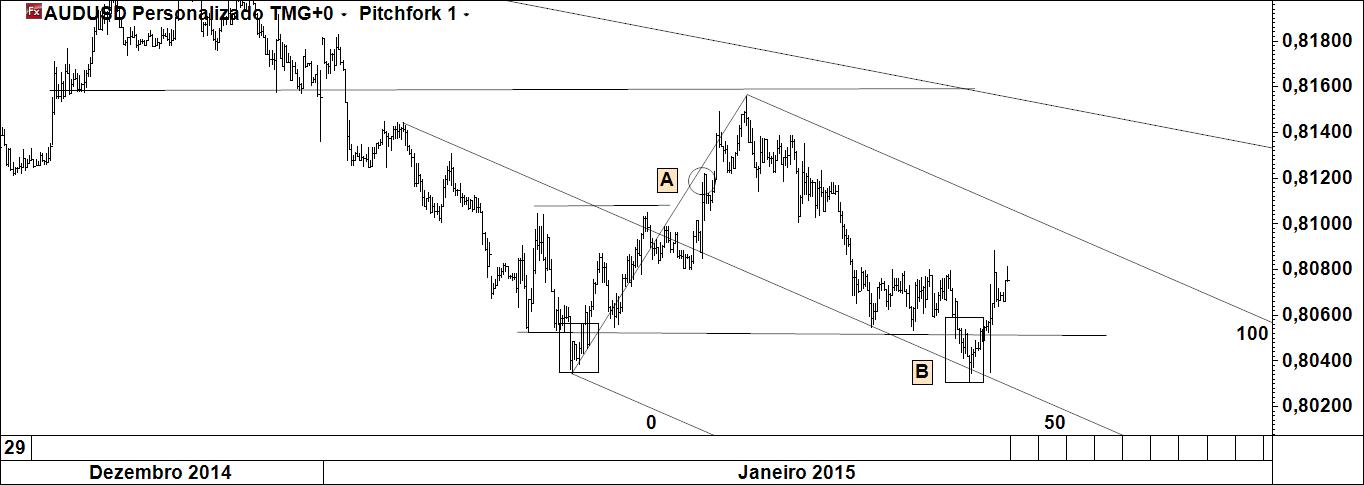 audusd: o preço estava em A quando colocámos o anterior post. A ideia era esperar pela concretização da mensagem aí descrita (“Buy on weakness.”). Como? Indo à caixa de ferramentas e usando o que aí se encontre e faça sentido. Após vasculhá-la encontrei o meu amigo fork. Foi só desenhá-lo e seguir duas das 5 regras: There is a high probability that: 1.Prices will reach the latest ML. 2.Prices will either reverse on meeting the ML or gap through it.