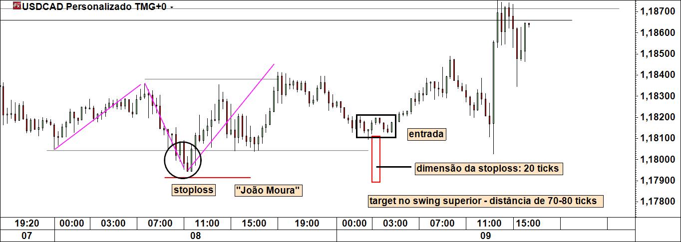 a stoploss foi colocada abaixo do "João Moura" - 1º gráfico com vista aproximada da zona. Ou seja, 20 ticks abaixo do preço de entrada, com target 70/80 ticks, por corresponder a um anterior máximo. Cumprindo-se o meu r:r mínimo, foi só colocar as ordens.