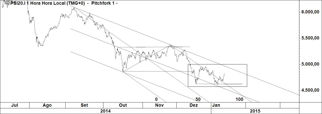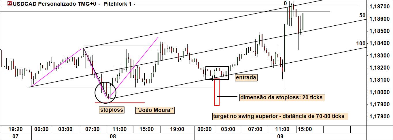 O "João Moura" corrsesponde a um pivot que podia ser usado na construção do fork tal como se pode ver do 2º gráfico. Quem quisesse podia só usar este fork para negociar, usando a mesma stop. Isto é, stop para um caso e stop para outro caso são idênticas. A beleza está nisto: a mecânica e as ferramentas variam (no exemplo eu usei umas simples linhas, mas também se podia ter usado o tal fork), o sítio para a stoploss não.