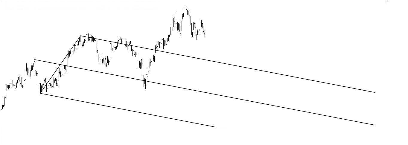 2º gráfico: oportunidade especulativa construída com base no desenvolvimento de uma das regras (sua verificação ou falha) e no contexto do mercado em causa: Frequently, after crossing a lower MLH, prices continue to rise along the MLH before the further drop that was signaled by passing through. So here you can use a sliding parallel through the bottom of the range of the most recent day as a sell signal if prices drop through that SH.