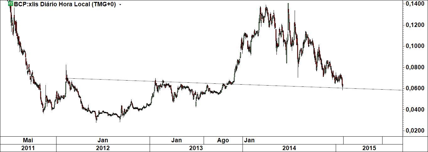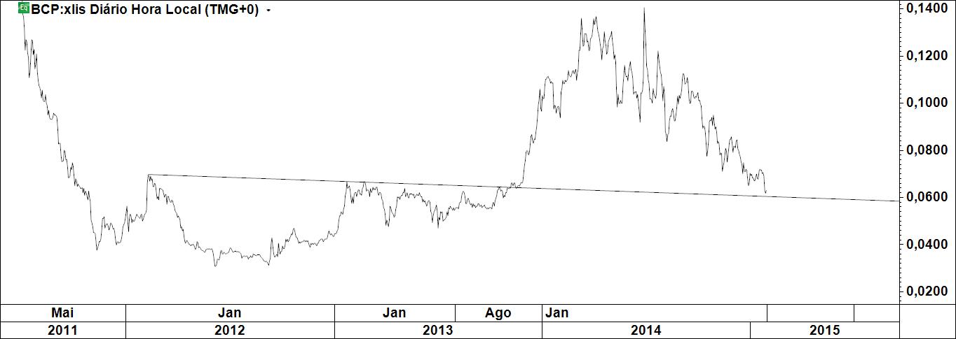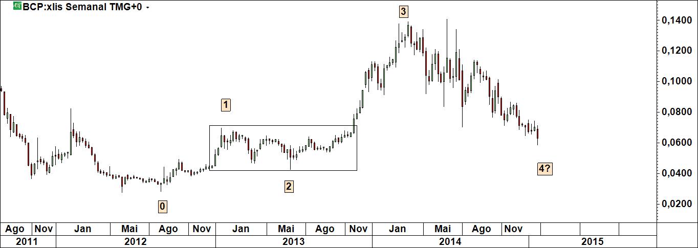 Um estudo sobre o bcp. Na área seleccionada pode estar a razão que levará à inversão do preço. O preço tanto pode parar no cimo da caixa, como no seu meio ou no seu fundo, ou seja, entre os seus extremos há uma variação de cerca de 40%. Quem quiser assumir um risco desta magnitude não espera. Quem quiser esperar tem de encontrar um nível que lhe dê confiança.