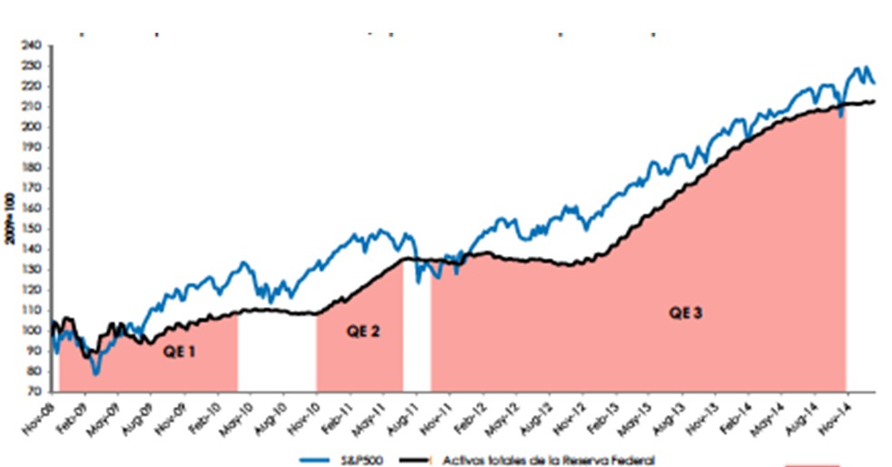 Num dos gráficos, pode-se ver a experiência dos 3 QE's implementados nos EUA e os seus efeitos positivos no mercado acionista americano, traduzido no indice S&P 500.